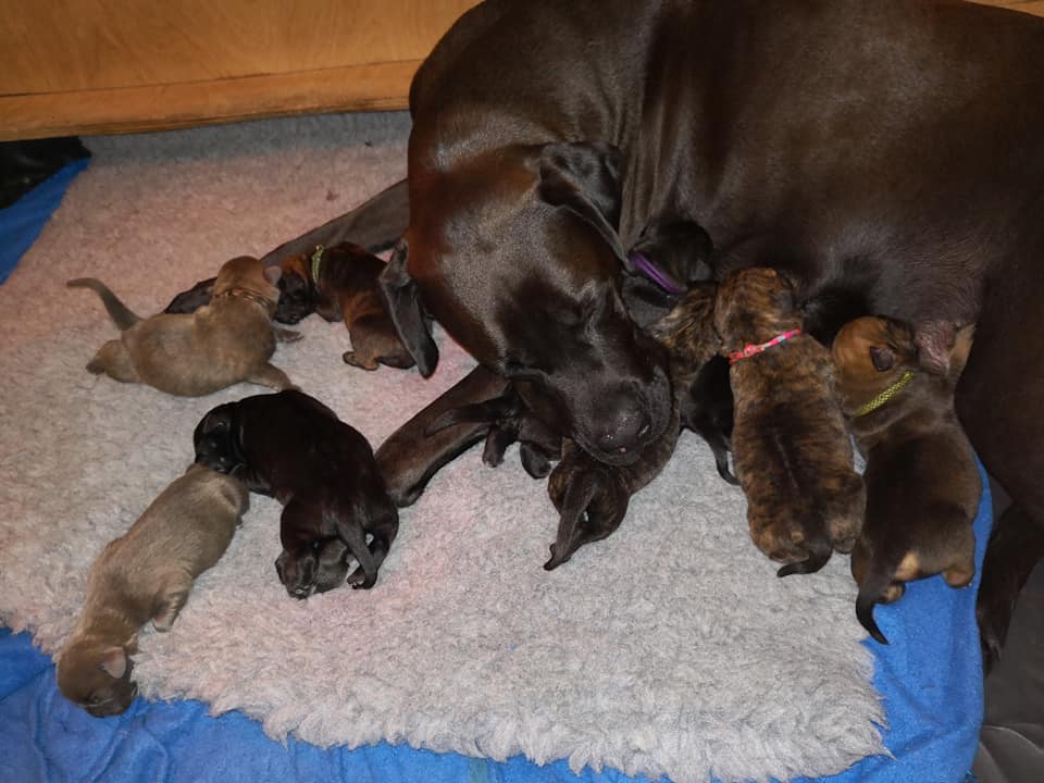 9 putzmuntere Welpen (5 Mädels und 4 Jungs) in einer blitzschnellen Geburt zur Welt gebracht.